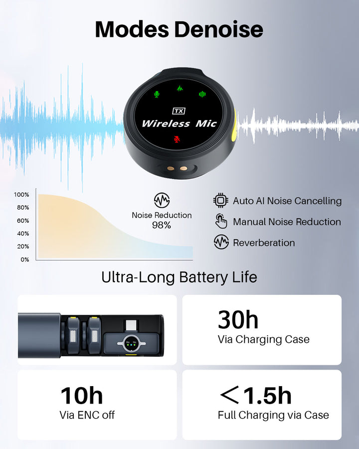 - Omnidirectional Mic with Noise Reduction: Supports one-click on the yellow button to turn on/off the noise cancellation on TX and RX. The built-in intelligent active noise Cancellation chip and advanced 2.4GHz transmission technology, which allows you to record clearly in noisy environments, which can provides more vivid, soft, natural and stereo sound around for recording or real time video.